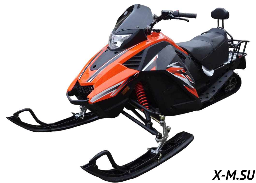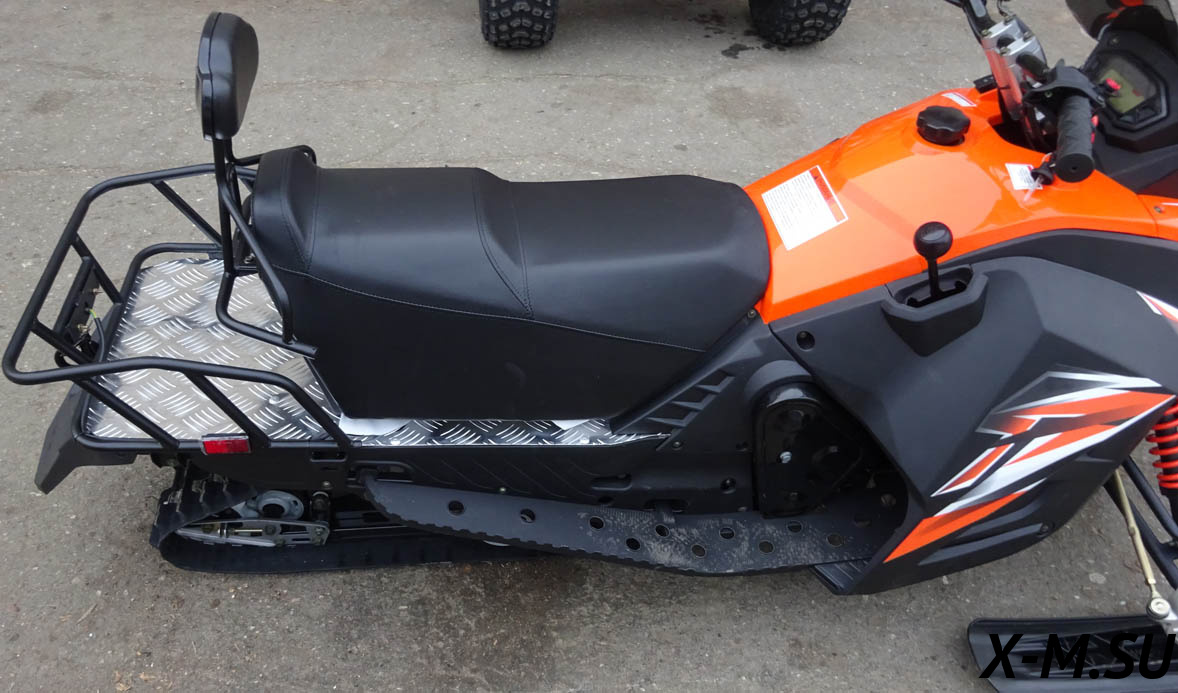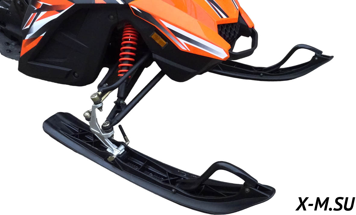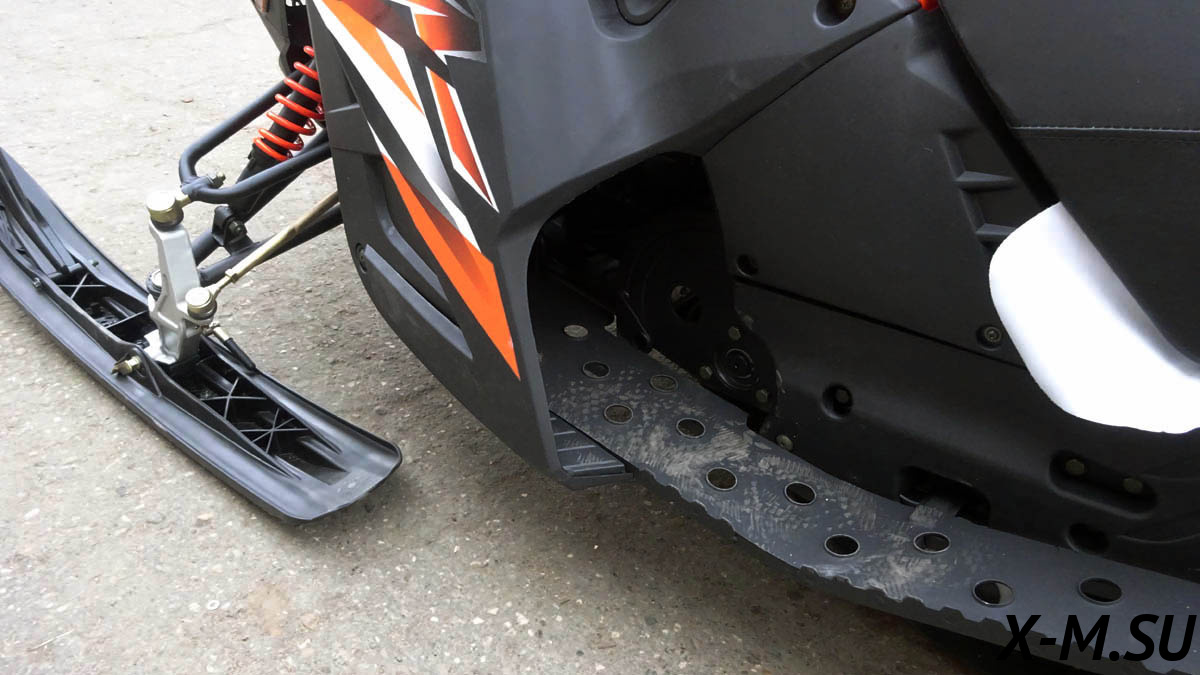 Армированная гусеница снегохода обладает хорошим сцеплением со снегом и обеспечивает безопасность райдеру. Кроме того, она позволяет устройству преодолевать подъемы с уклоном до 20°. На снегоходе установлена: передняя подвеска — рычажная с амортизатором.